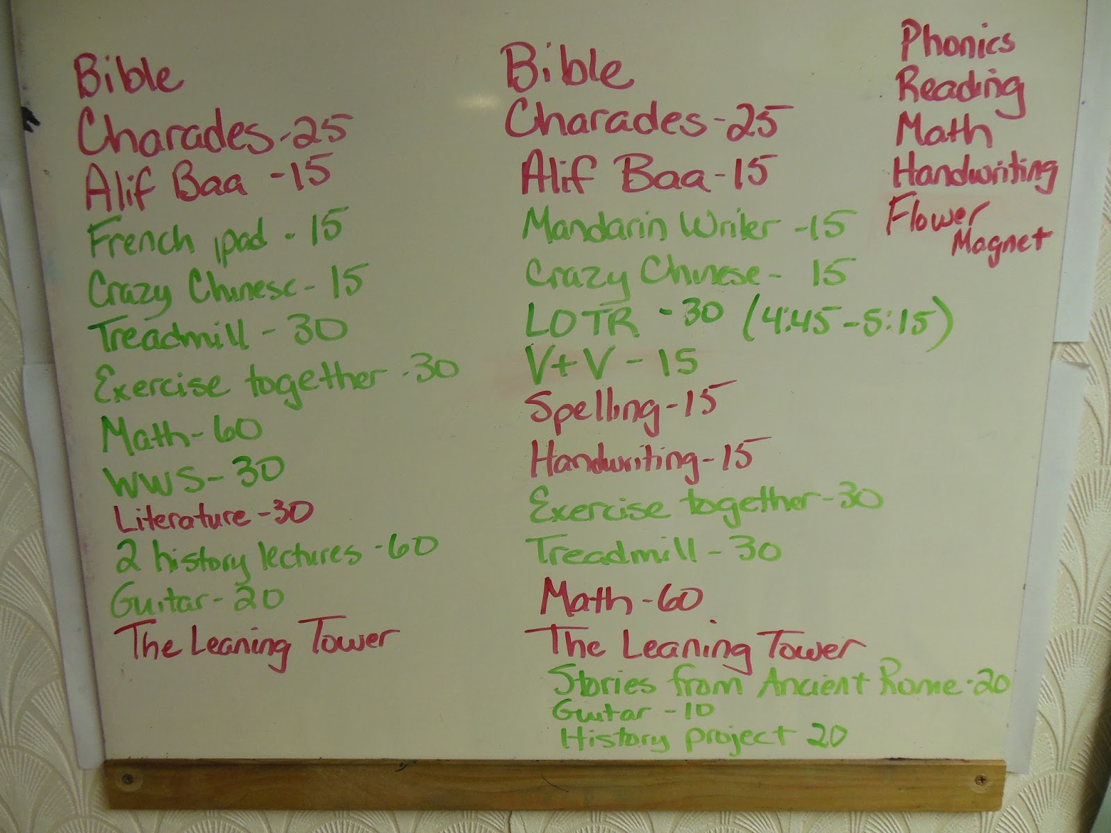 Here is our list. The first column is for my 5th grader and the middle column is for my 3rd grader. The last column is for my K4.