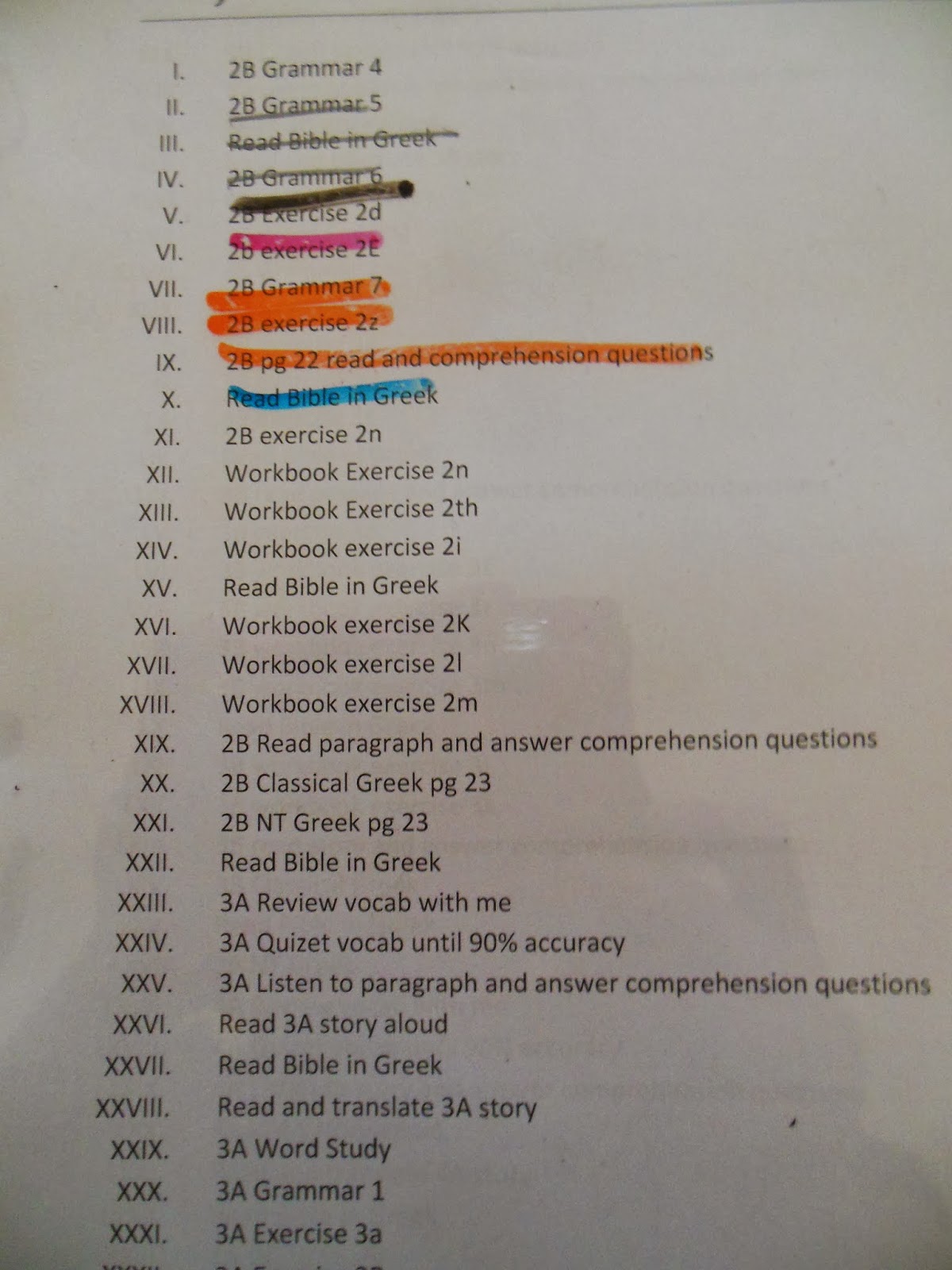 This is a printout of a chronological approach to ancient Greek using Athenaze I’ve interspersed reading the Bible in Greek with the textbook and workbook. For foreign language we just continue to work at an exercise until the child masters the concept.