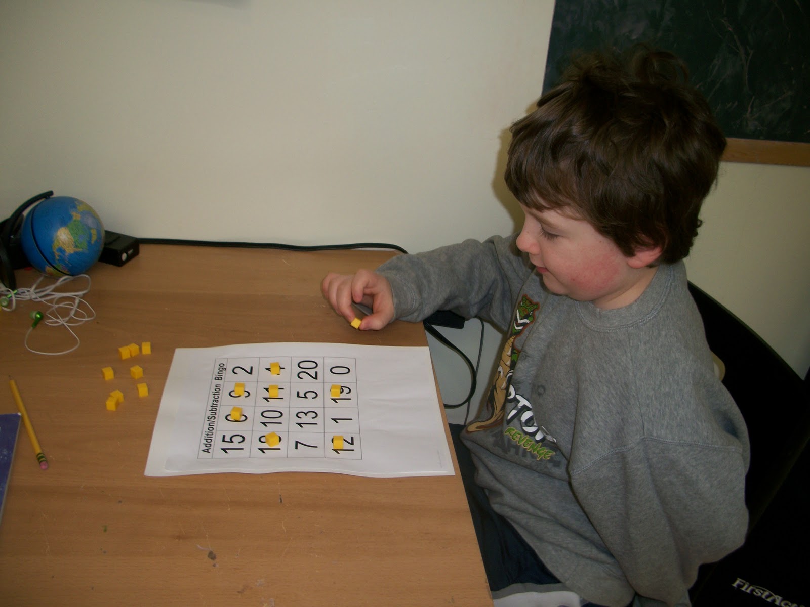Flashcards can then be used to give the child an addition or subtraction problem and once they answer correctly they can put a token/chip on the spot with that number. You can play blackout or four in a row. We tried blackout once so far and ended up with a tie so maybe four in a row works better for these Bingo games. The highest number on the cards is 20 and the lowest number is 0.