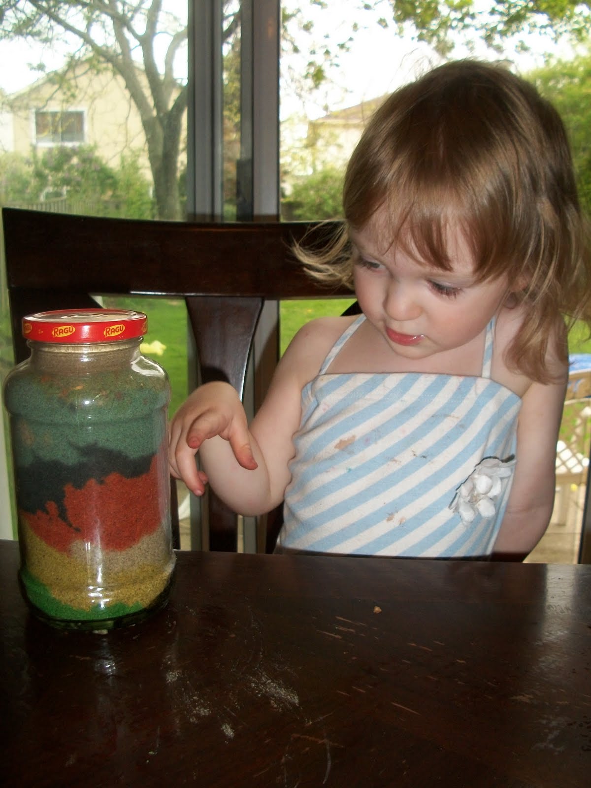 I had washed and dried out three different glass containers because I knew my little girl would want to do the activity too. I was right. I gave her a wide mouthed jar. She finished quickly.